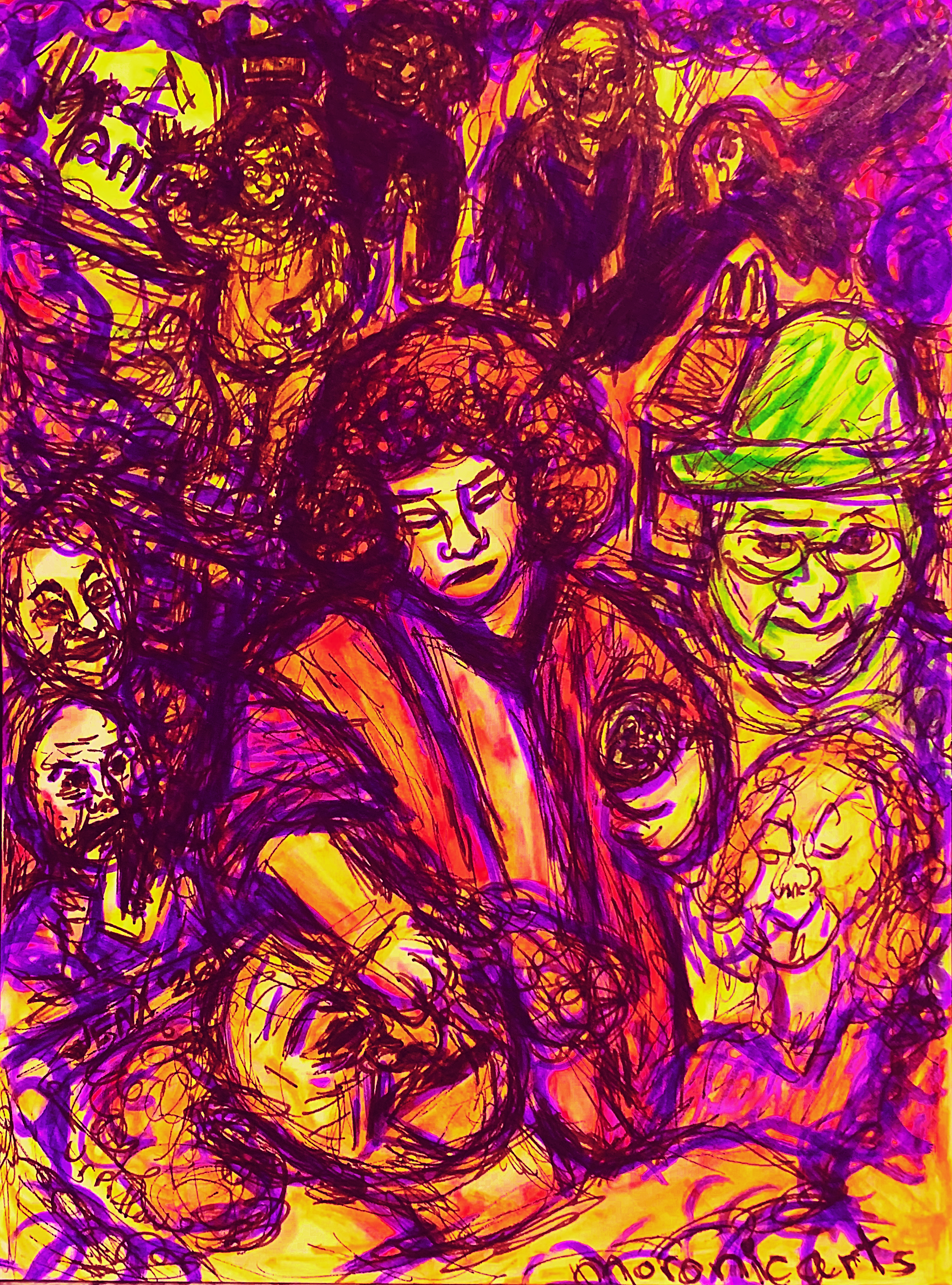 “Hey Diana! Check out this big, beautiful picture my Peppi smoked up for me!” Manteno entramanure, bog witch and communal narcadoodle Bernadette Cacca brags about the huge printout containing her likeness surrounded her bootlickers, to her neighbors Gothic Diana Ross and the Midnight Supremes.