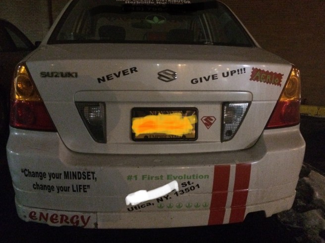 I was walking toward my apartment building when I spotted this Failmobile. I photographed the car with my phone, which I had never seen before in my apartment complex, thinking it would make a great specimen for my favourite “Sounds Like MLM But OK” Facebook group (the non-ban happy one). After I took this photo, contact details edited out to protect the guilty, a young lady unbeknownst to me came out of the woodwork like a long lost classmate messaging you on Facebook.