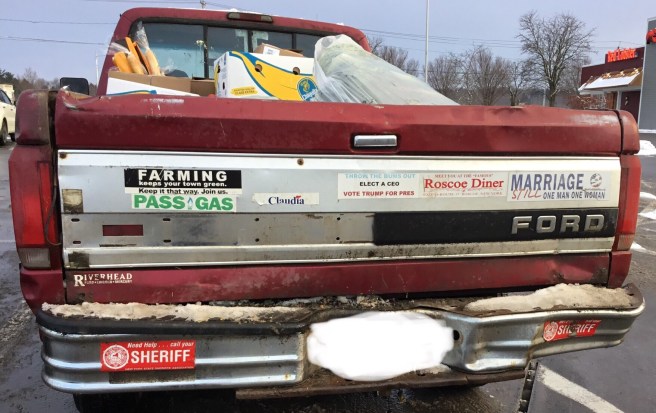 I spotted the homophobic bumper sticker on this imbecile machine and instantly crowned this White Anglo-Saxon, Presumably Protestant (WASPP) couple. Shortly after I took a single snapshot of the offending truck, its drivers accosted me, saying “she either really likes ‘em or she really hates ‘em.” I asked the middle-aged woman who uttered said remark how she was doing; she said “God Bless you,” and asked me how I was.