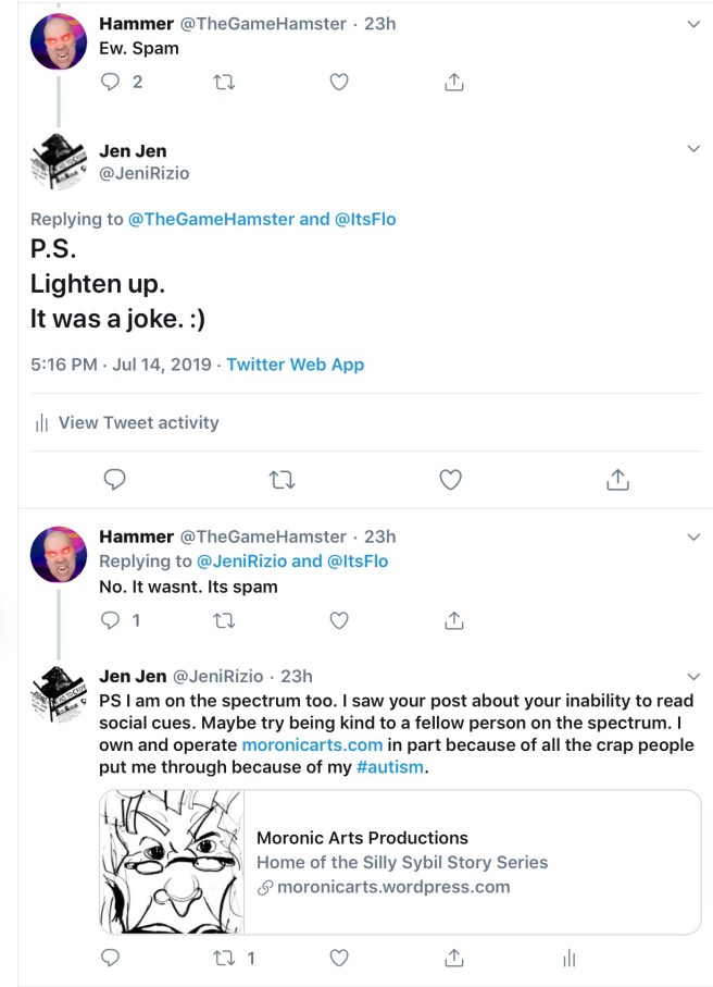 On a Facebook support group, this little moron was not so supportive. You see, she argued with me for the sake of arguing, much like Grump Whisperer Leona Krabalsky would. When she lost the argument, she got ugly. She said I had no friends, much like a grade schooler bullying a classmate. But wait, there is more! This moron had the nerve to make fun of me for being on the autism spectrum. As if she thought making fun of people with disabilities was cool.