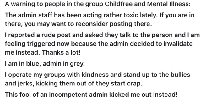 Anyone who has spent time posting in a Facebook group knows what it is like to deal with loser posters and even bigger losers who are too lazy to administer their groups. Take this creep. She administers a group called Childfree and Mental Illness. Given the title, one would think think the group is a safe space, to you know, talk about their feelings, get some advice and a whole lot of affirmation too.