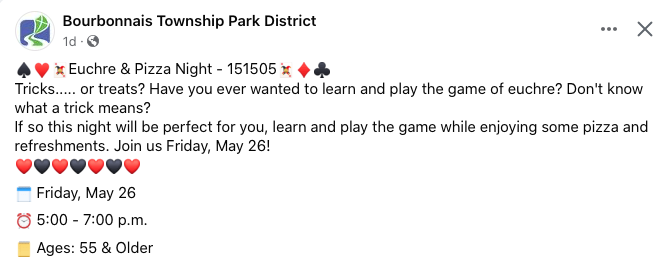 “Well, there is this card game…ooops. Nope, we’re not old enough,” Diana laughs as she reads the community events.