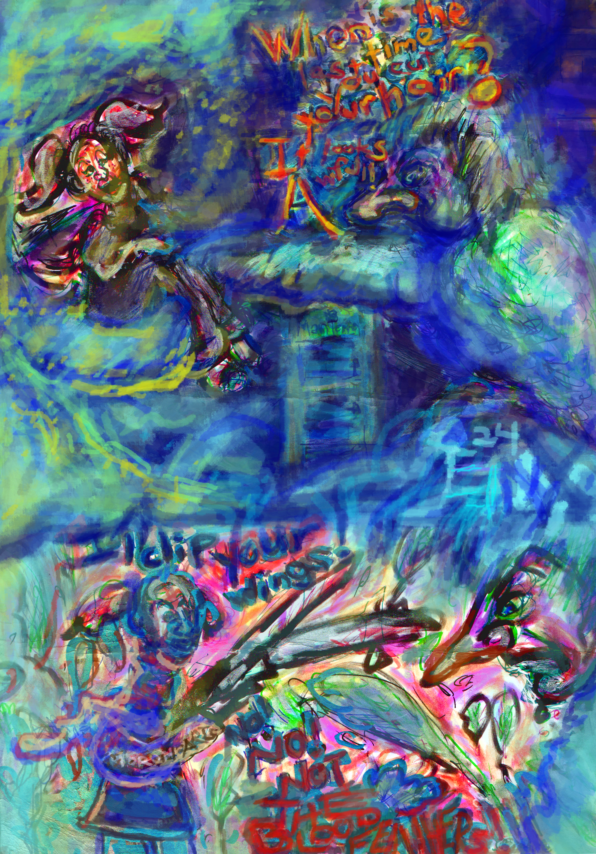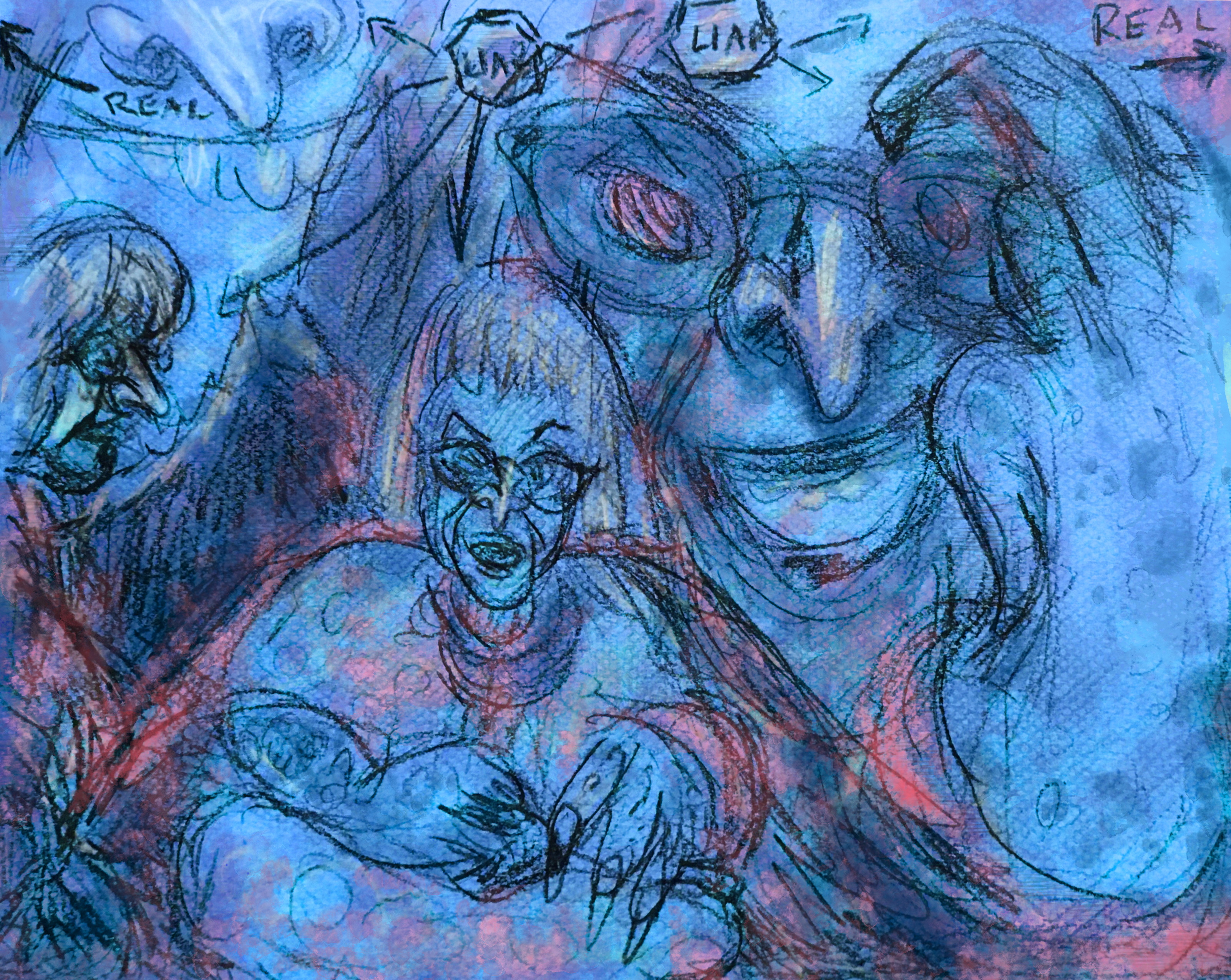 “Just give me one more chance, I will never lie to you again…Hahahahahahah. Sucker!” shapeshifting humanoid turkey vulture and narcadoodle of the self-righteous kind Carla Moran continues to hiss at her daughter Bernadette, who runs upstairs to her washroom and starts playing accordion show-tunes again.