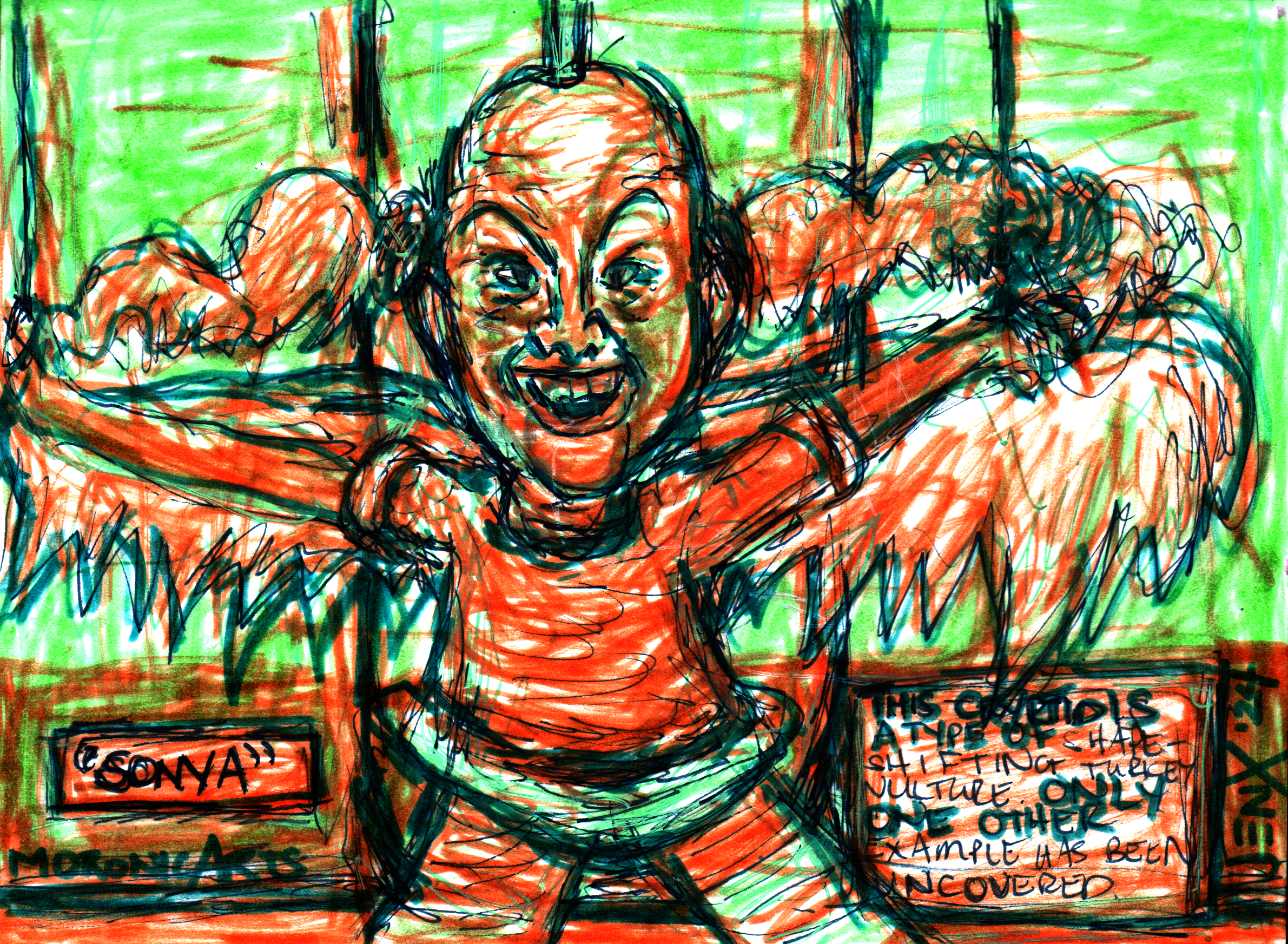 “Excuse me, excuse me sir, YOUR laundry is done!” shapeshifting humanoid turkey-vulture Carla Moran squawks at Konrad “Kon” Teirant who had fallen asleep at the Manteno mini-casino/laundromat “Spin-n-Sudz.”