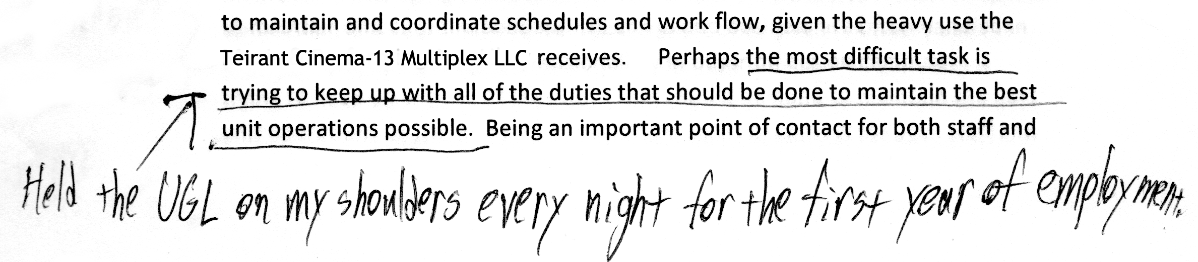 While cleaning out his ex-employee’s desk, Teirant Cinema-13 owner Konrad Teirant found Damien’s scribbled-on evaluation forms. Behold, the work of a master-moron!