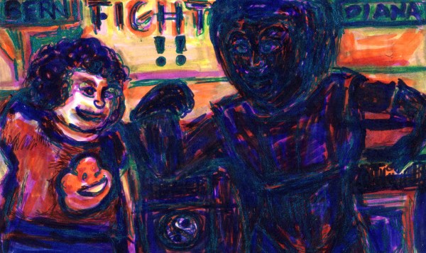 “I’ll show you respect!” Gothic Diana Ross knocks the angry bird straight into the ground with a single punch, Carla’s long, pointy beak stuck straight into the grass. The inverted bird’s long, dark tail sticks straight up with her cloaca for all the neighbors to see.