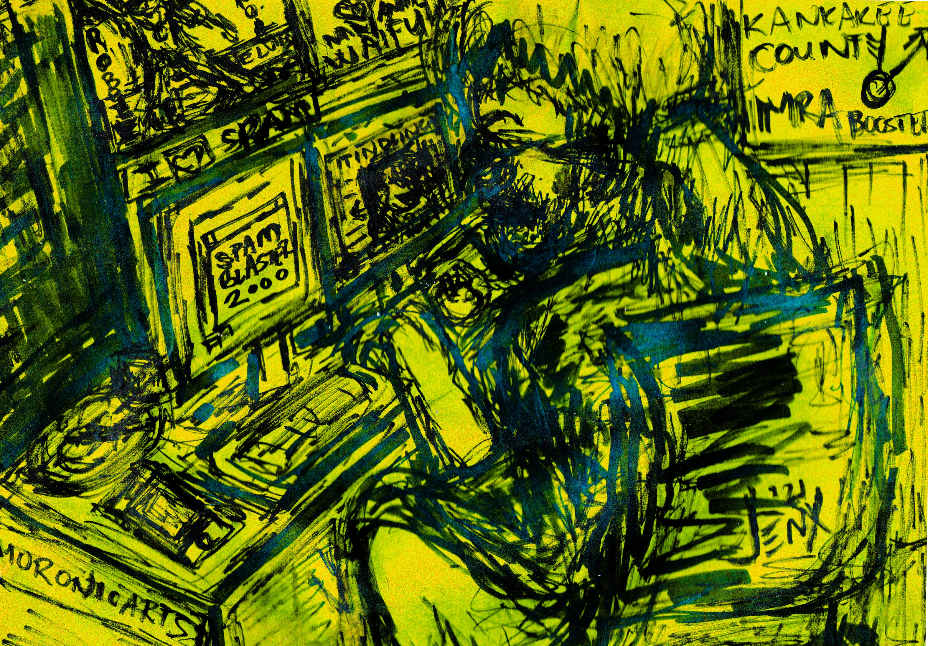 After the picture finishes its run and the ushers escort all the guests, Damien collects the newsletter sign-up sheet and heads to his Bourbonnais neckbeard-nest to sleep on the floor. Before he can retire for the night, he get annoyed over the mess of texts and photos from his brother Robbie. Damien would rather sleep in his mess of plastic tubs, and boxes of the things he loves more than people, than head back to Kankakee to pick up a drunk. Thinking he can gain something from helping his brother, he drives down to the Kankakee bar at which Robbie is performing slurred Elvis Presley Karaoke. The two bumbling idiots get into Damien’s beat-up van and head home.