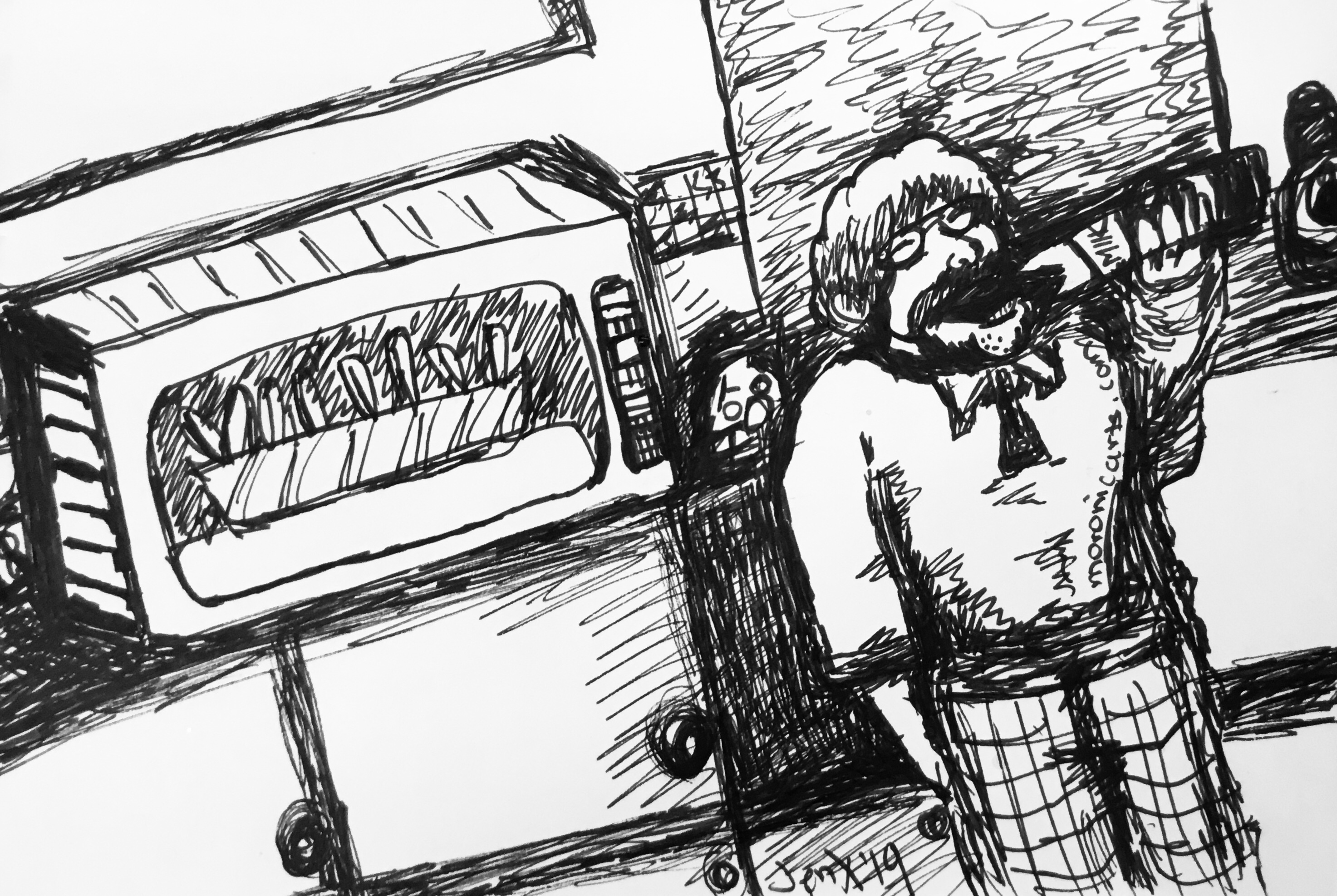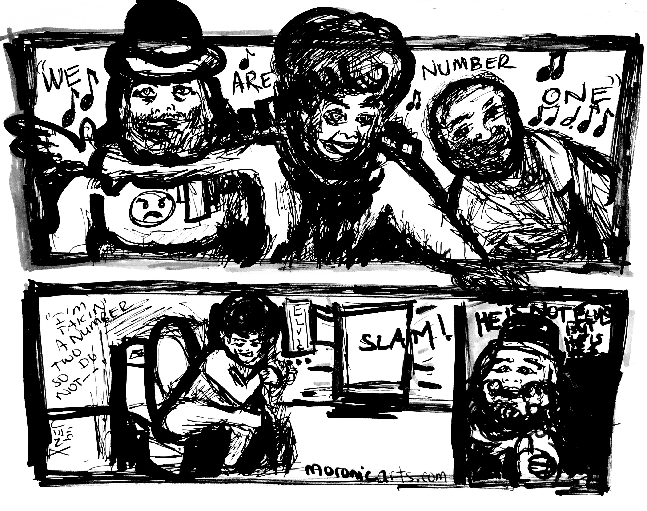 Kankakee pharmacy clerk, vulnerable narcissist and Elvis impersonator Robbie Hurlbutt, his equally narcissistic brother Damien and con-job roommate Andy Skandees join together for one rotten number. Robbie’s Youtube clones could not make it. Don’t close the washroom door.