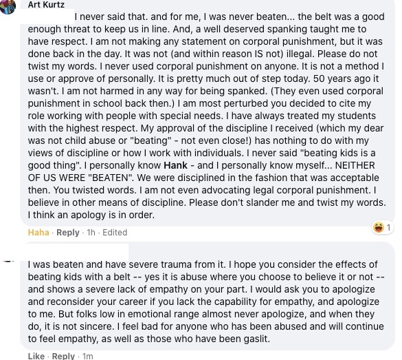 This ableist fool thinks it is okay to beat kids, with a belt no doubt. Last I knew, it was illegal to hit adults, however this narcissistic moron thinks it is okay to hit little ones. He also thinks it is okay to force kids with food texture problems to eat food that makes them gag, or have them starve as an alternative.