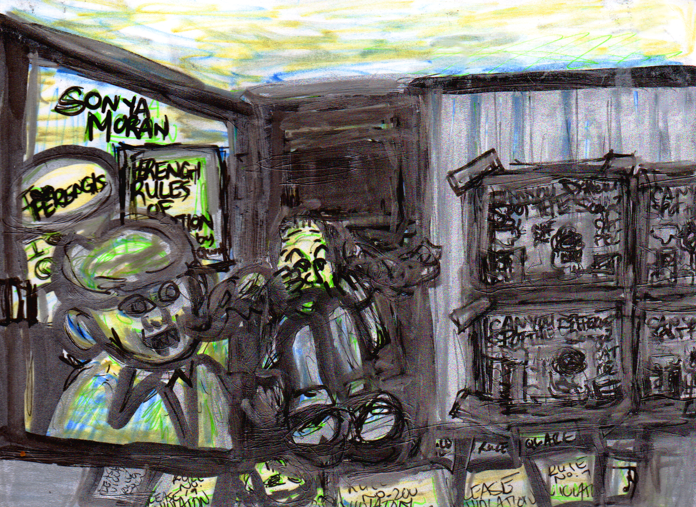 Sonya Moran, slumlord, shapeshifting humanoid turkey vulture and president of Bernadette Cacca’s fan-club The Poopy Groupies hears her phone jingle, ringtone singing the bathroom blues of The Mentors.