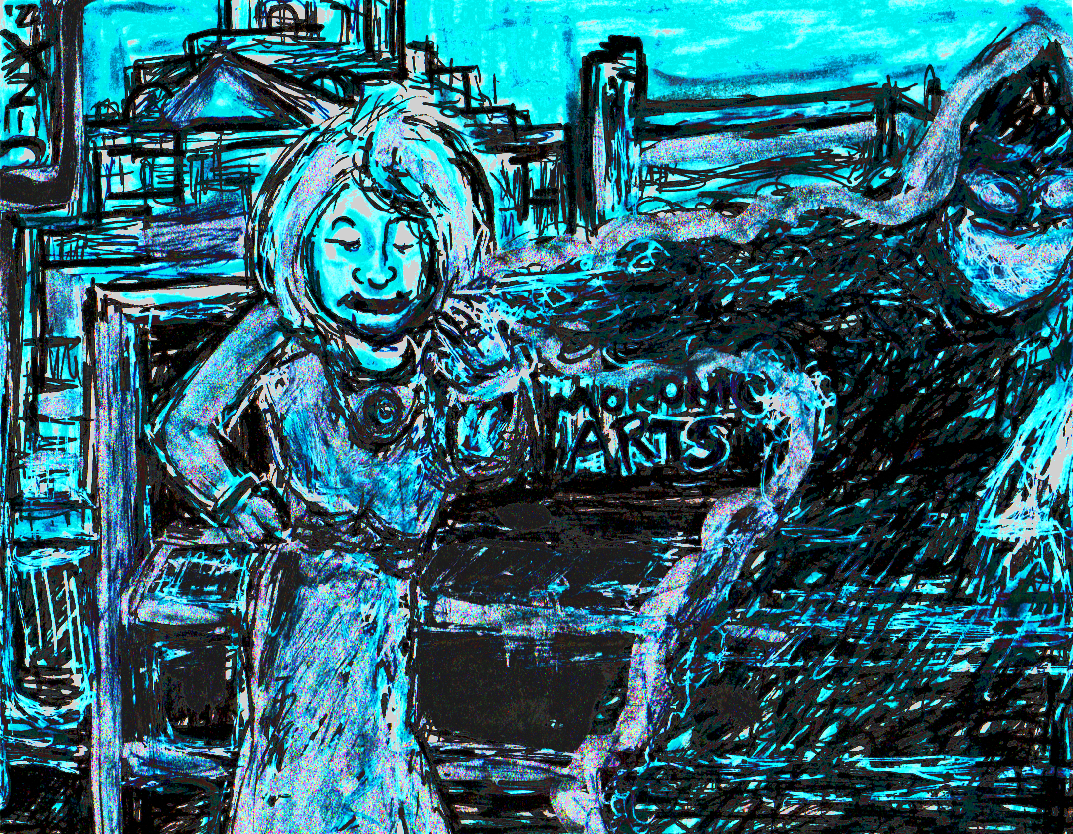 The swamp-witch Bernadette lifts her leg and her bum goes boom.